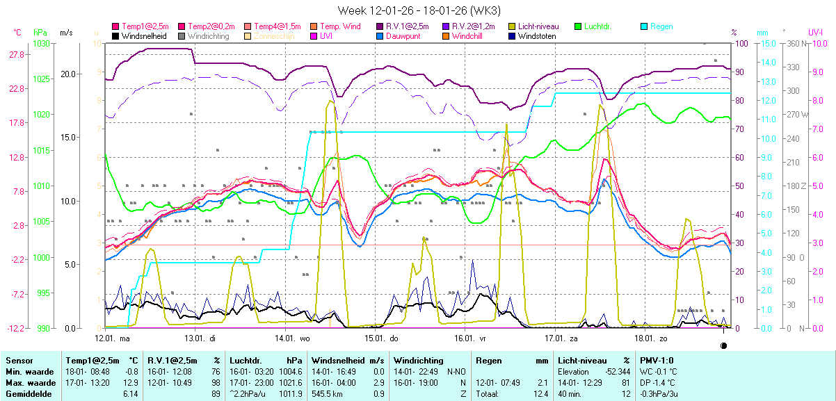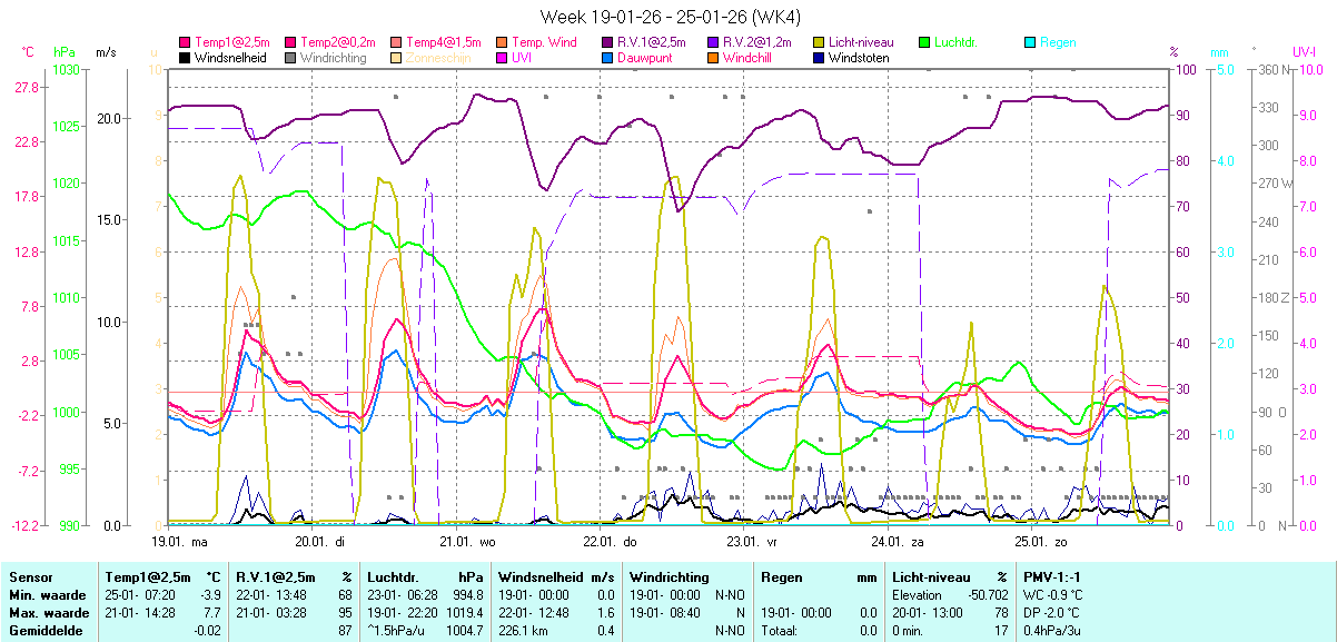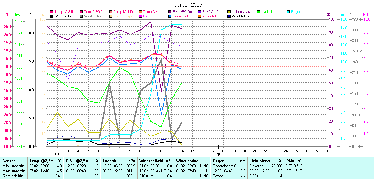 Online uitlezing van Temperatuur, R.V., Luchtdruk, Wind en Neerslag |