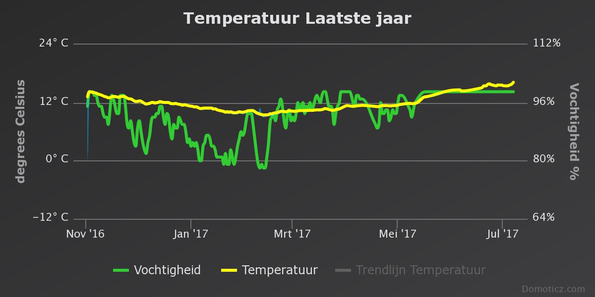 De grafieken hieronder tonen het voorgaande resp. het volgende historisch verloop voor temperatuur en vocht.